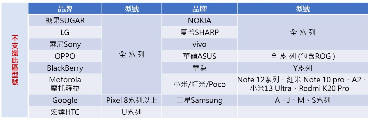 2.不支援:鎖卡機、電信業者客製機、網路分享器、T-Mobile 4G 網路之手機、2019前出廠之手機裝置、台灣未上市之手機裝置、山寨機、亞太機、外國電信公司鎖碼之綁約客制化 3G 手機或平板電腦、定製機、鎖卡機、仿冒機(合約機:電信商配合)、平板、分享器。